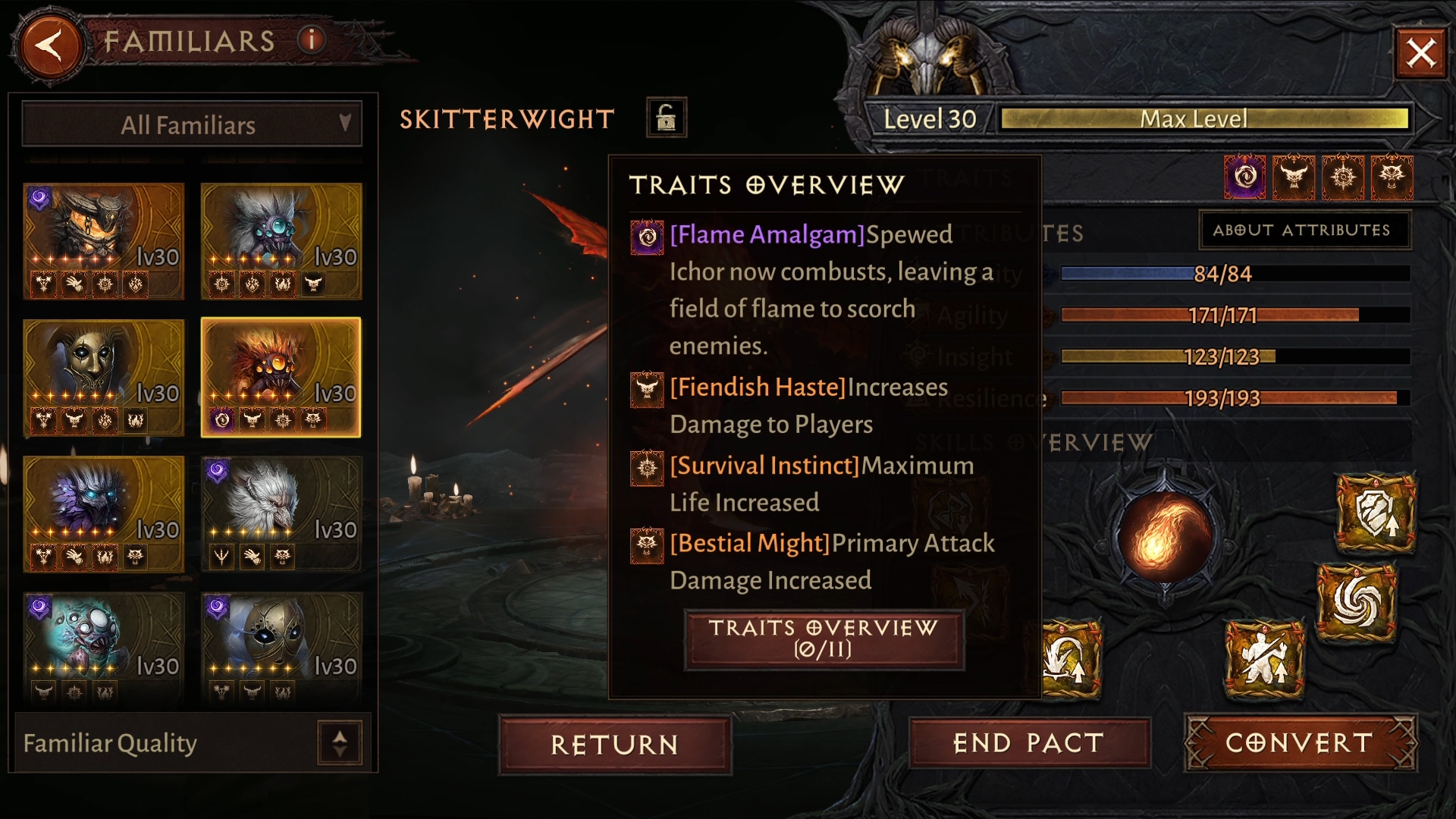 Al someterte a la conversión, tus familiares aberrantes tienen la probabilidad de converstirse en una nueva subespecie. Los familiares que se sometan a esta transformación heredarán un nuevo rasgo legendario llamado amalgama y sus habilidades activas se verán mejoradas.