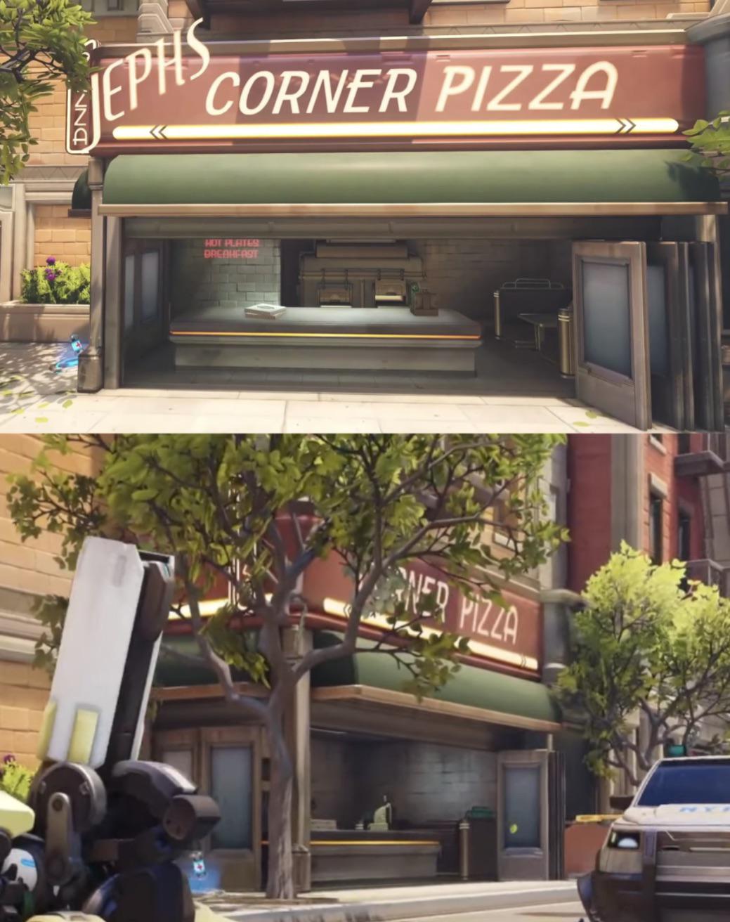 En el transcurso de la retransmisión y mientras se jugaba la final de la Overwatch League, se realizó una partida de exhibición en el mapa de Nueva York, novedad de Overwatch 2. El usuario CeeLo38 de Reddit se percató rápidamente de un cambio en el mapa de lo que anteriormente pudimos ver, y no es más que la eliminación de la referencia a Jeff Kaplan (anterior Director de Overwatch) en el cartel de una pizzería, tal y como se muestra en la imagen.