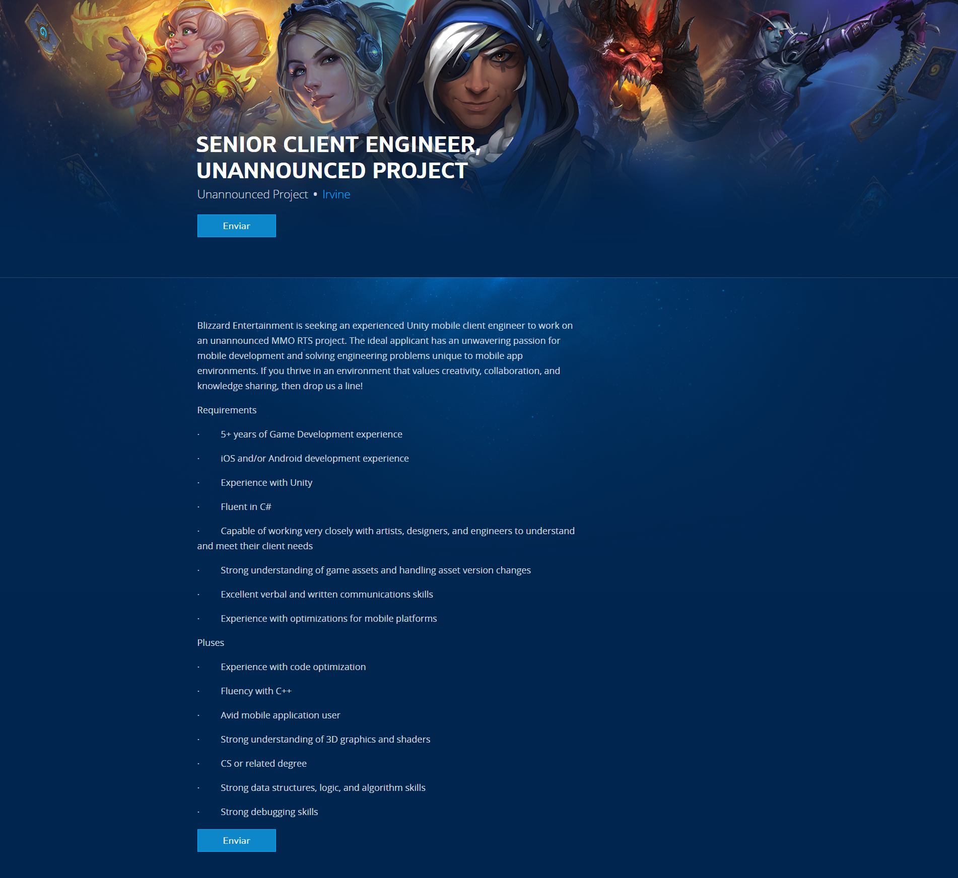 Aunque meses atrás nos sorprendíamos con el anuncio de varios puestos de trabajo para un proyecto relacionados con móviles y Warcraft, de nuevo han saltado las alarmas con este anuncio. Desconocemos si todas esas ofertas se encuentran relacionadas o si por el contrario, veremos un proyecto MMO RTS y algo relacionado con Warcraft. Esperemos que la BlizzCon de este año nos aclare un poco estas dudas y veamos finalmente un nuevo juego en el horizonte...