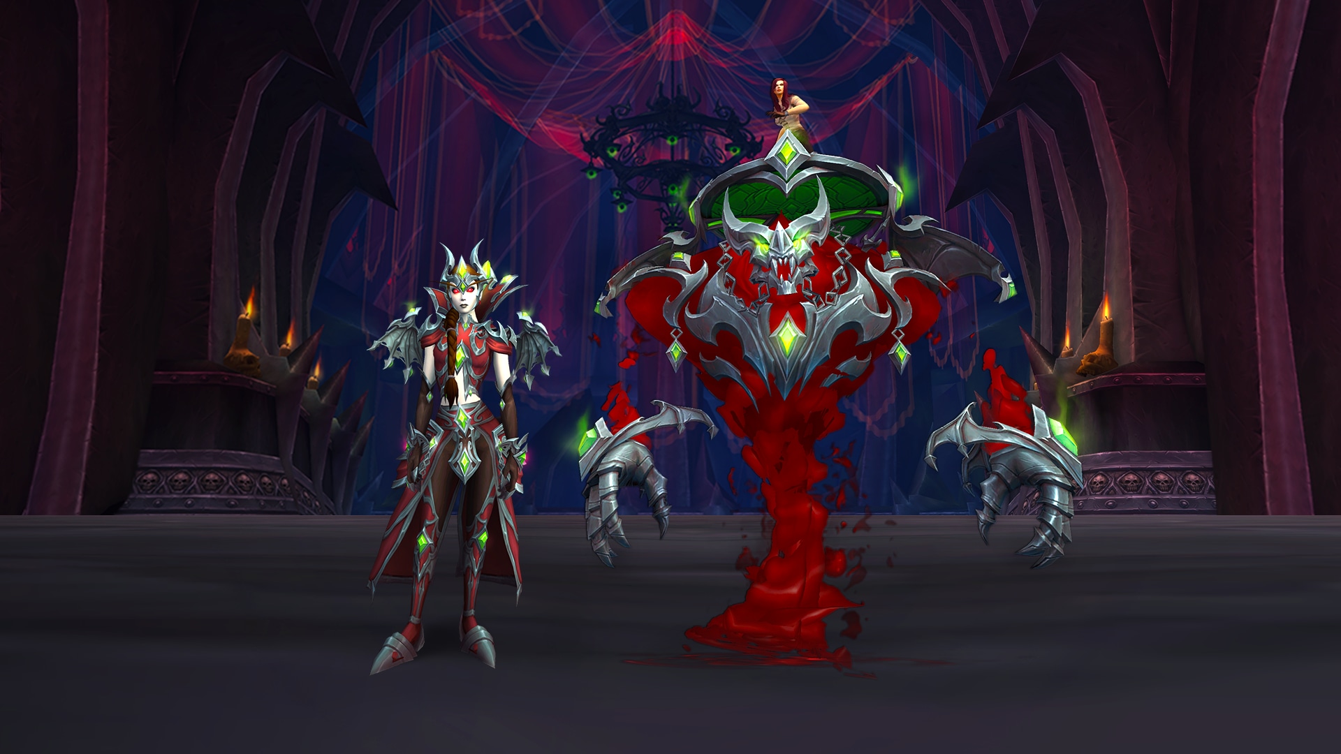 Mata al estilo sanguino con este conjunto de transfiguración inspirado en Lana'thel y con la montura cascada carmesí incluida en el pack de la corte carmesí*, disponible hasta el 12 de enero de 2026.