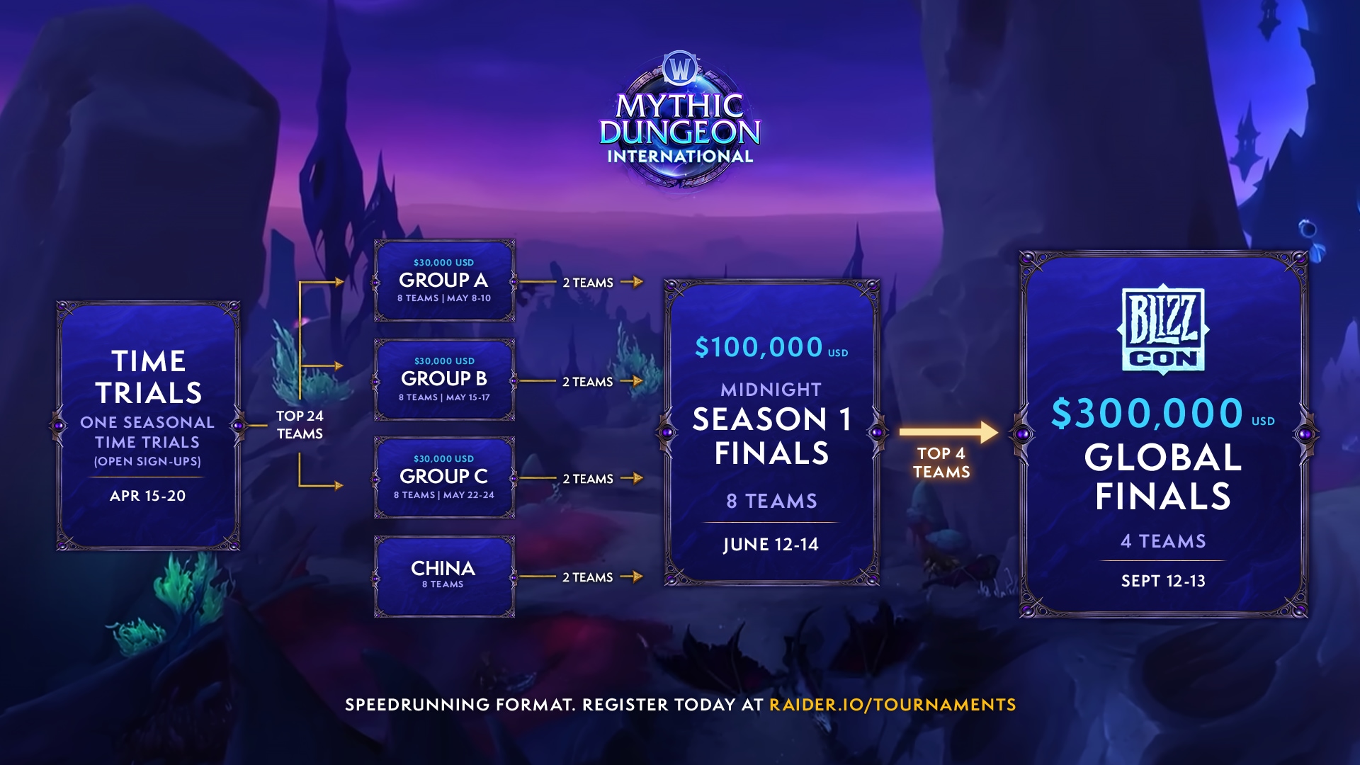 Esta nueva temporada competitiva arranca el 15 de abril con las contrarrelojes. Cualquier equipo puede inscribirse para participar, acceder a los reinos de torneo y superar el desafío de completar dos mazmorras lo más rápido posible. Los 24 equipos más rápidos pasarán directamente a la fase de grupos del MDI el 8 de mayo.