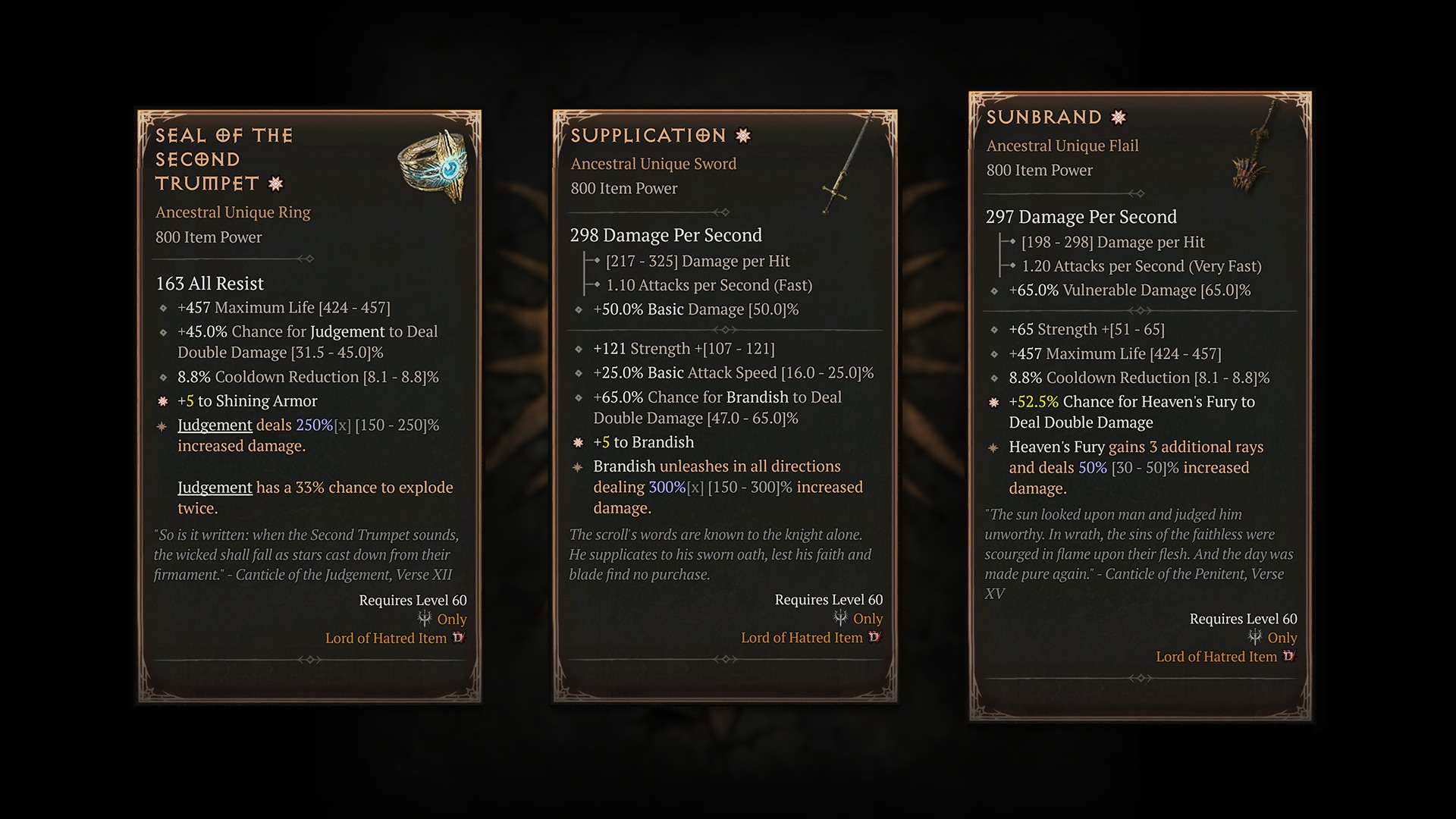 Martillo bendito inflige daño aumentado. Golpe de suerte: Hasta un X % de probabilidad de que aparezca un Martillo bendito base en el objetivo golpeado.