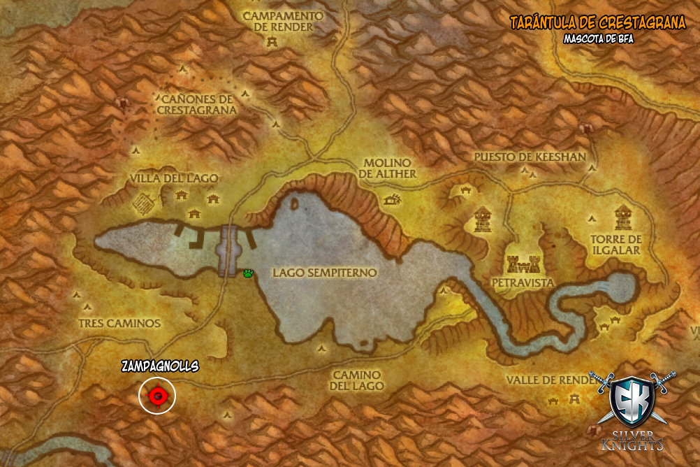 Para conseguir esta mascota, tendremos que viajar hasta las Montañas Crestagrana y más concretamente al Camino del Lago (coordenadas 24.08 - 70.90) para encontrarnos con la criatura Zampagnolls. Dicha criatura se adaptará al nivel del héroe que lo ataque y tendrá un 100% de posibilidad de otorgarnos el Huevo de tarántula de Crestagrana una vez que lo derrotemos.