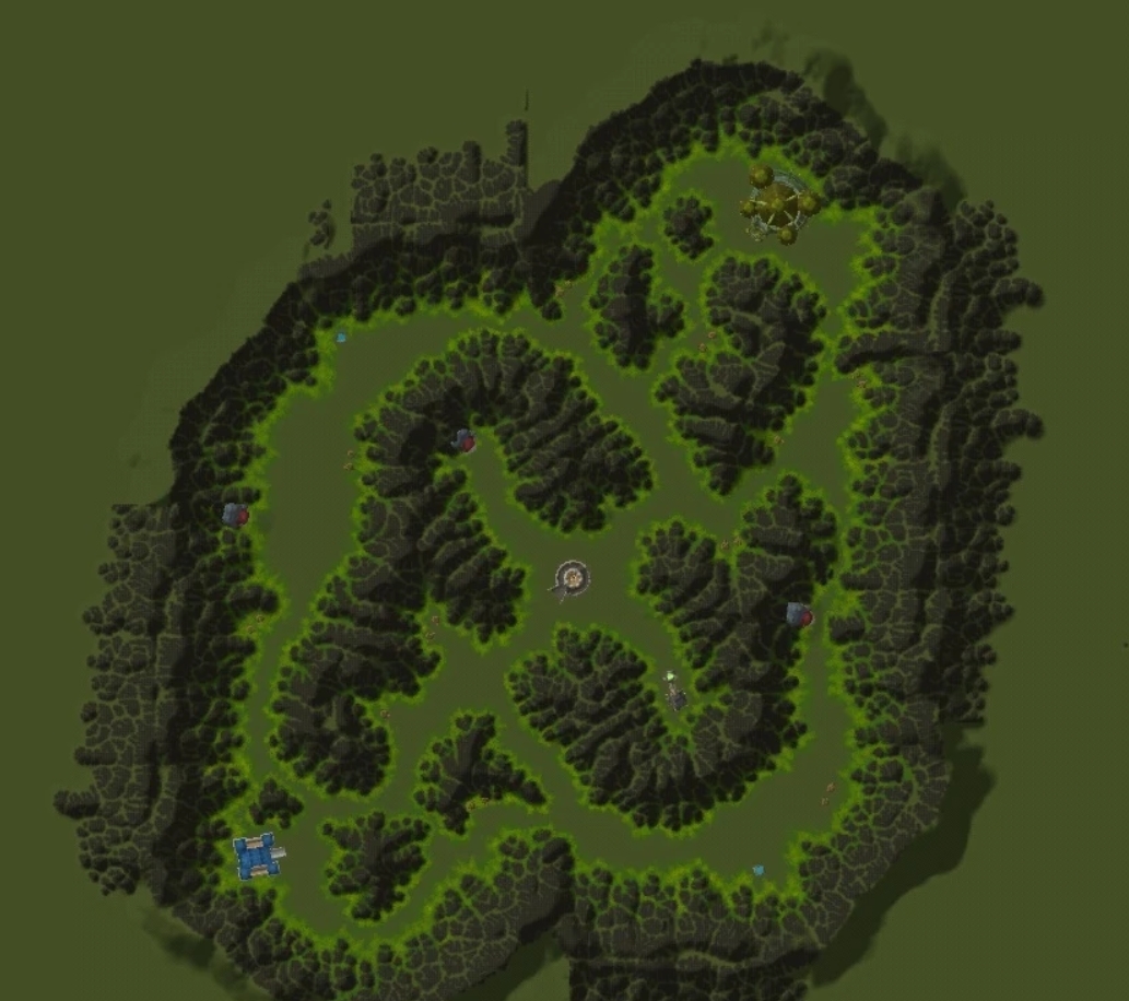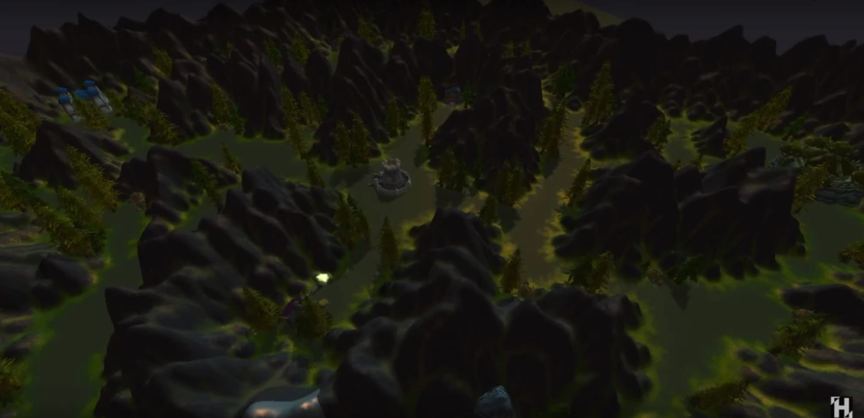 En el corazón del campo de batalla se alzaba una torre de vigilancia, rodeada por un laboratorio goblin, indicando la presencia de elementos estratégicos clave en el mapa. Además, había tres entradas a minas dispersas a lo largo de los caminos principales, sugiriendo un enfoque en la recolección de recursos para impulsar la guerra. Dos pequeños pozos de luna y varias chozas de trols del bosque completaban el paisaje, añadiendo un toque de autenticidad al entorno.
