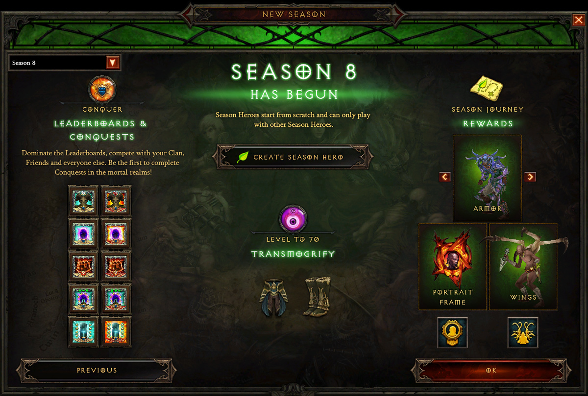 ¡La temporada 8 de Diablo III ya ha empezado en todas las regiones! Para crear un héroe de temporada, tenéis que elegir la clase, el género y el nombre, como siempre, y luego marcar la casilla «Héroe de temporada», en la parte inferior izquierda de la pantalla.