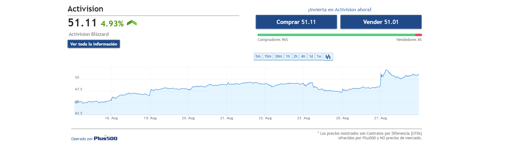 Esto se ha hecho notar en las acciones de Blizzard, llegando hasta un máximo de 52.22 dólares y vendiéndose a 50.35 dólares, aproximadamente un 6% más que el cierre del día anterior (48.69 dólares).
