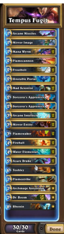 Este mazo de MAGO esta enfocado en las sinergias de las magias que tomen el tempo en los inicios de la partida, forzando al rival a realizar jugadas con poco value y que no le permitan retomar el control de la situación. Han sido muchos los Magos Tempo que se han dejado ver este fin de semana en los clasificatorios americanos para la BlizzCon y aquí os traemos un remix de todo lo visto y analizado. Esperamos que lo disfrutéis porque este mazo es muy divertido.