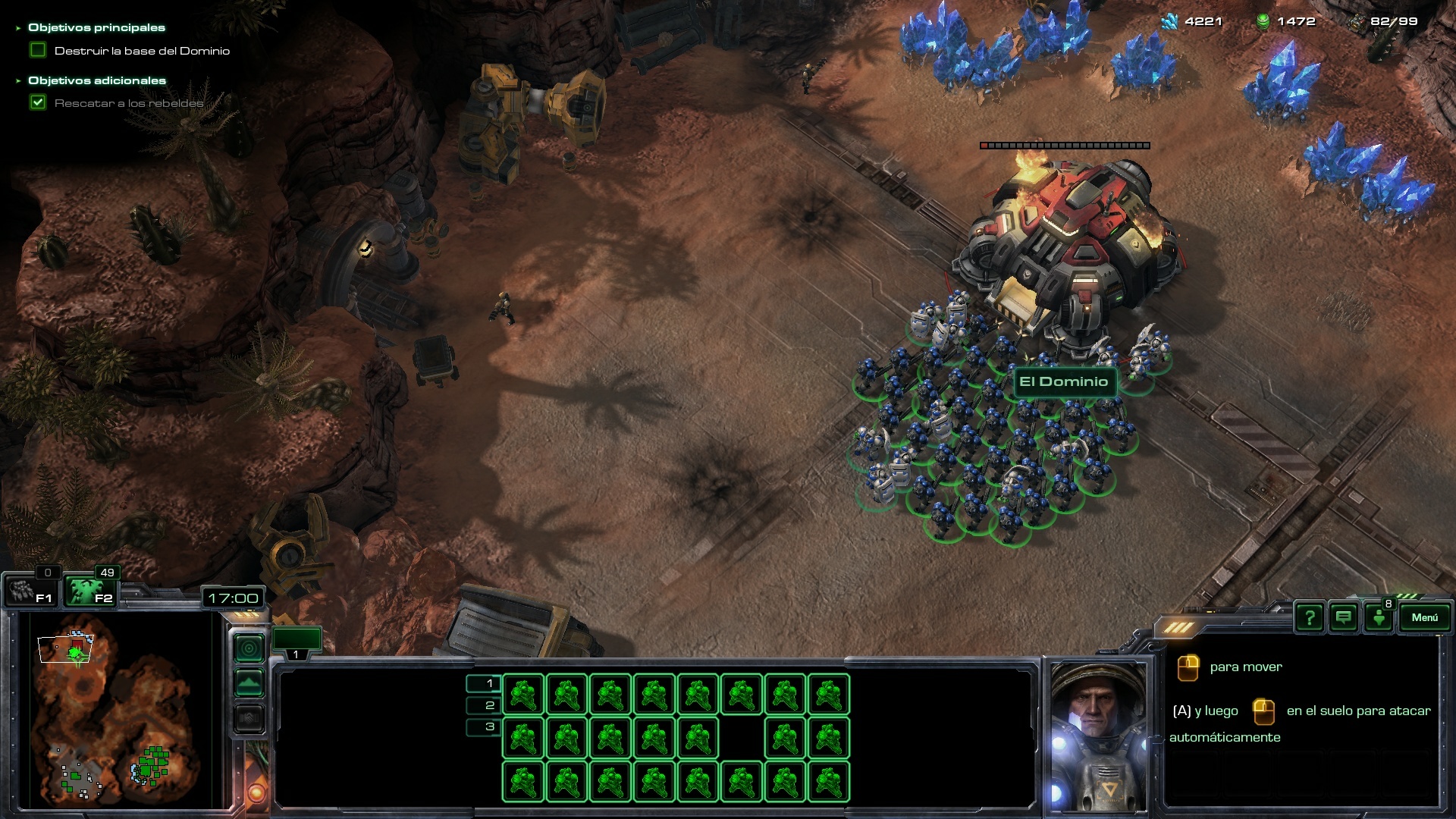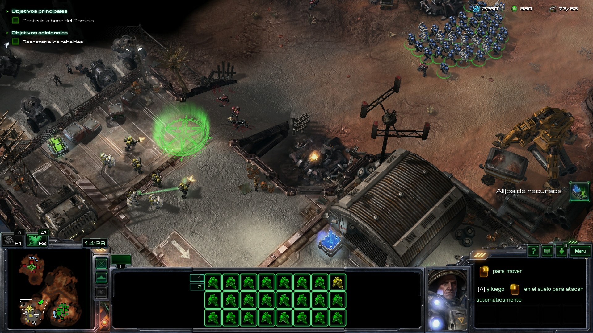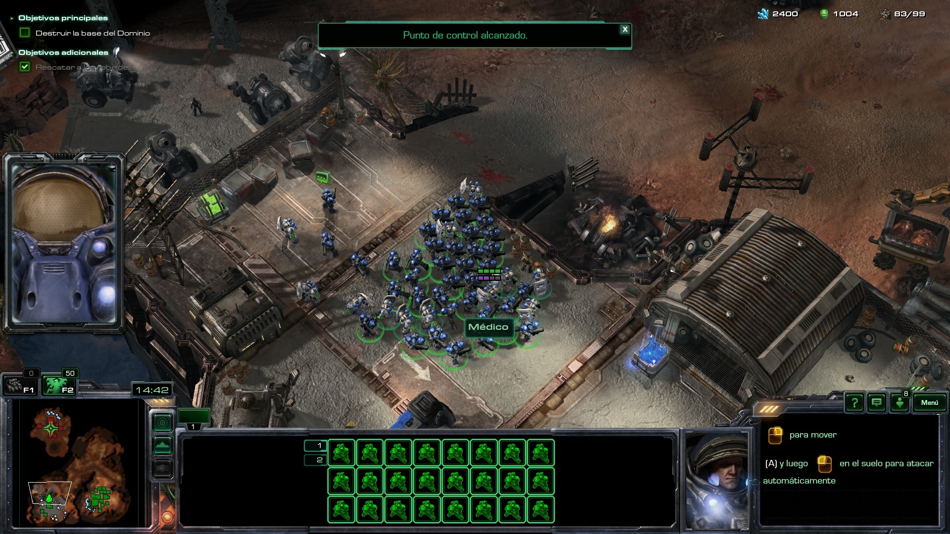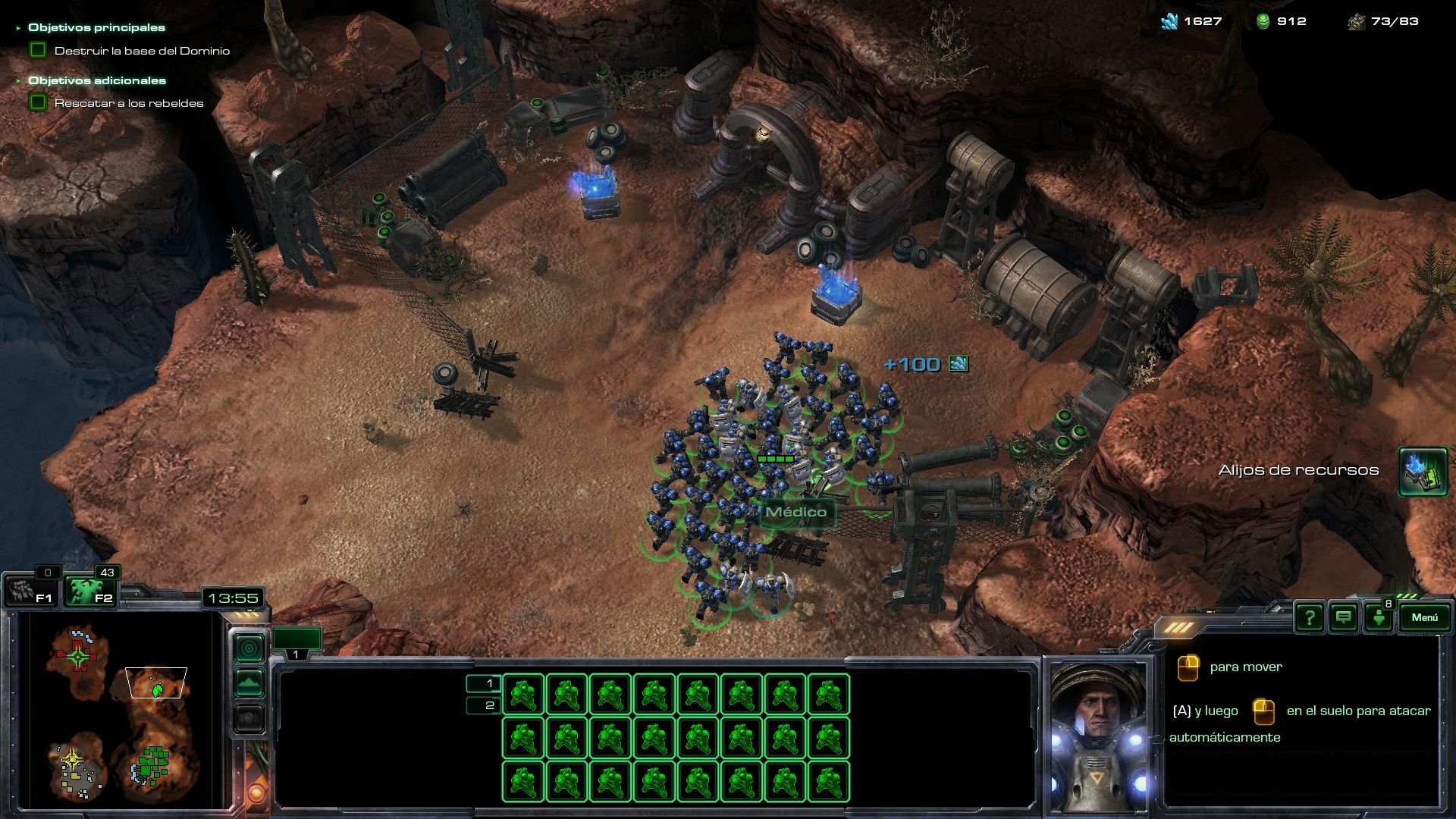 En la partida en modo difícil que he realizado, tenía 3 Barracones, uno de ellos con Médicos y los otros dos con Marines. Aproximadamente en el minuto 5.30 - 6.00 de la partida, he mandado todos las unidades a realizar el objetivo adicional, rescatar a los rebeldes. Con las tropas rebeldes de nuestro lado, más aquellas que siguen saliendo de nuestros Barracones, nos pondremos en marcha para ir destruyendo todas las unidades y estructuras enemigas en la base del Dominio.