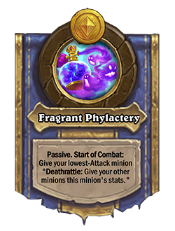 Antes: Filacteria fragante: Comienzo del combate: Otorga «Último aliento: Otorga el ataque de este esbirro a tus otros esbirros» a tu esbirro con menos ataque.