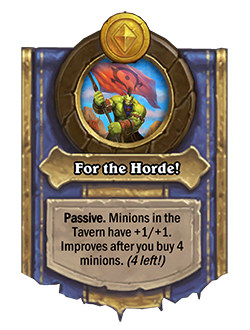 Ahora: ¡Por la Horda! [Pasivo]: Los esbirros de la taberna tienen +1/+1. Mejora después de que compres 4 esbirros. (¡4 más!).