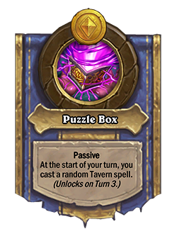 Ahora: Cubo rompecabezas [Pasivo]: Al comienzo de tu turno, lanzas un hechizo de taberna aleatorio. (Se desbloquea en el turno 3).