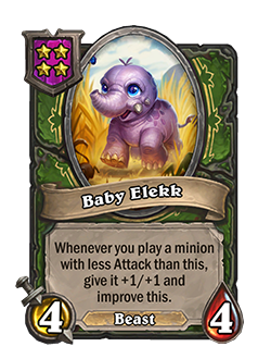 Ahora: [Nivel 4]. Cada vez que juegas un esbirro con menos ataque que este, le otorga +1/+1 y esto mejora.