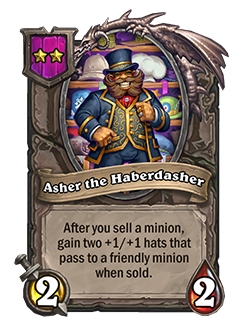 Antes: Después de que vendes un esbirro, obtiene un sombrero +1/+1 que pasa a un esbirro amistoso al vender este.