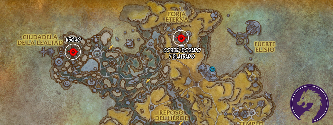 Cobre, dorado y plateado: varios puntos repartidos por la Forja Eterna, coordenadas 51.55, 17.72.