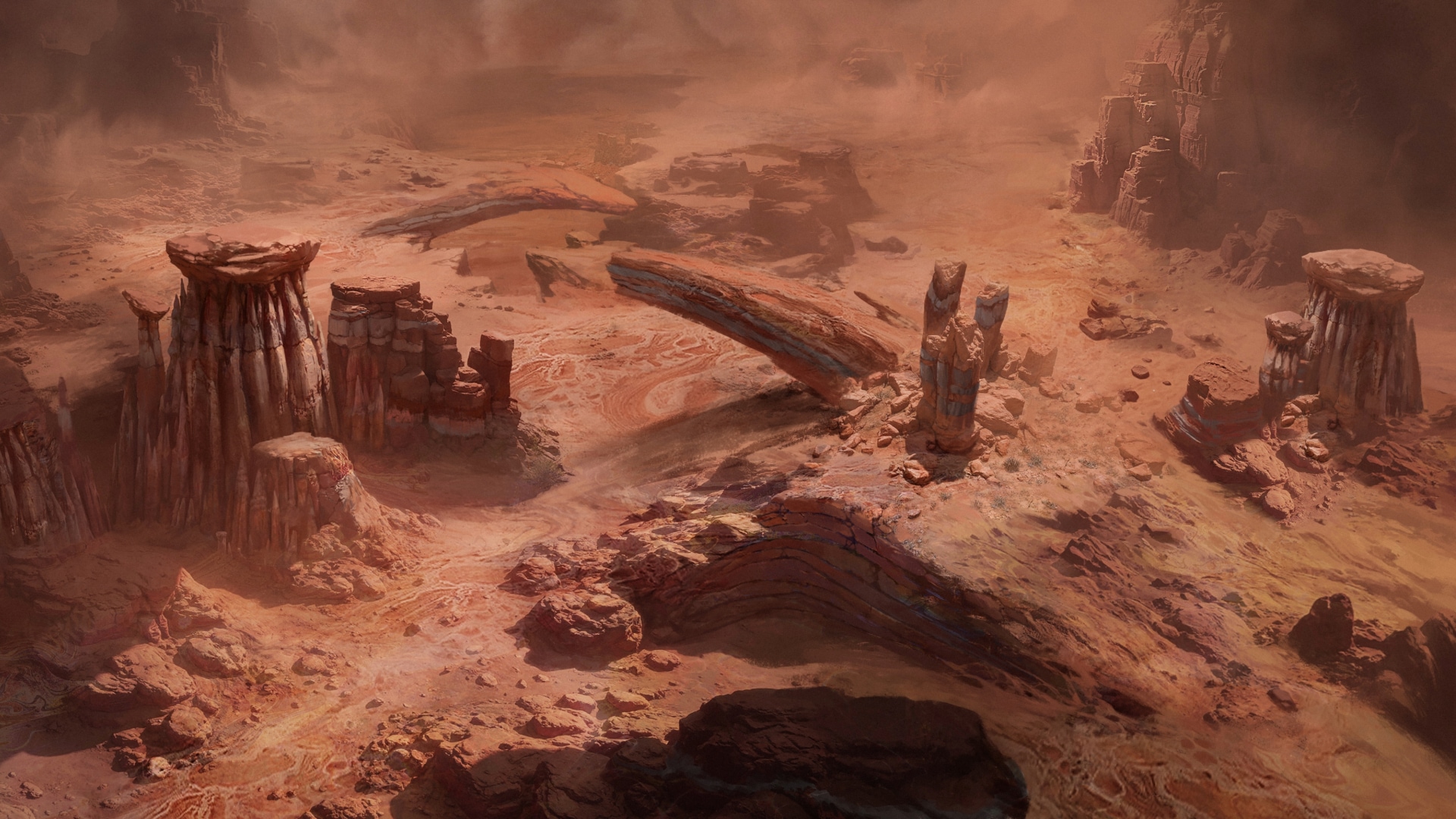 Estas implacables tierras baldías albergan fauna salvaje feroz: lobos espinosos, mantis de dunas, enjambres vivientes y buitres malignos. También habitan demonios de la angustia que han comenzado a forjar sus propios dominios brutales.