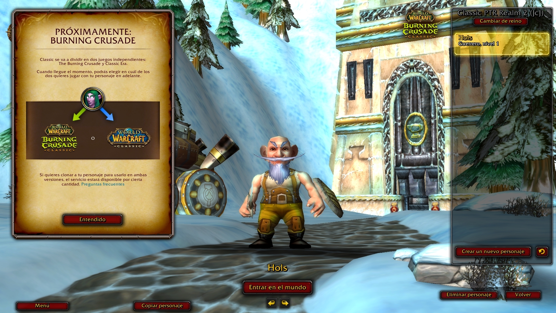 El reino de pruebas de Classic ha sido actualizado con algunos recursos que se relacionan de forma directa con Burning Crusade Classic. De forma más concreta, si accedemos a la pantalla de creación de personaje, podemos encontrar un anuncio de la próxima llegada de Burning Crusade y la elección que tendremos que tomar con nuestro personaje.