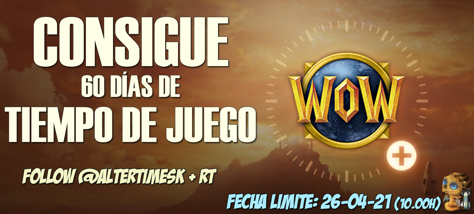 Desde AlterTime queremos traeros un sorteo muy especial para nosotros. Durante esta semana y hasta el día 26 de abril (10.00 h), tendréis la oportunidad de conseguir 60 días de Tiempo de Juego (para todo el mundo) en la tienda oficial de Blizzard.
