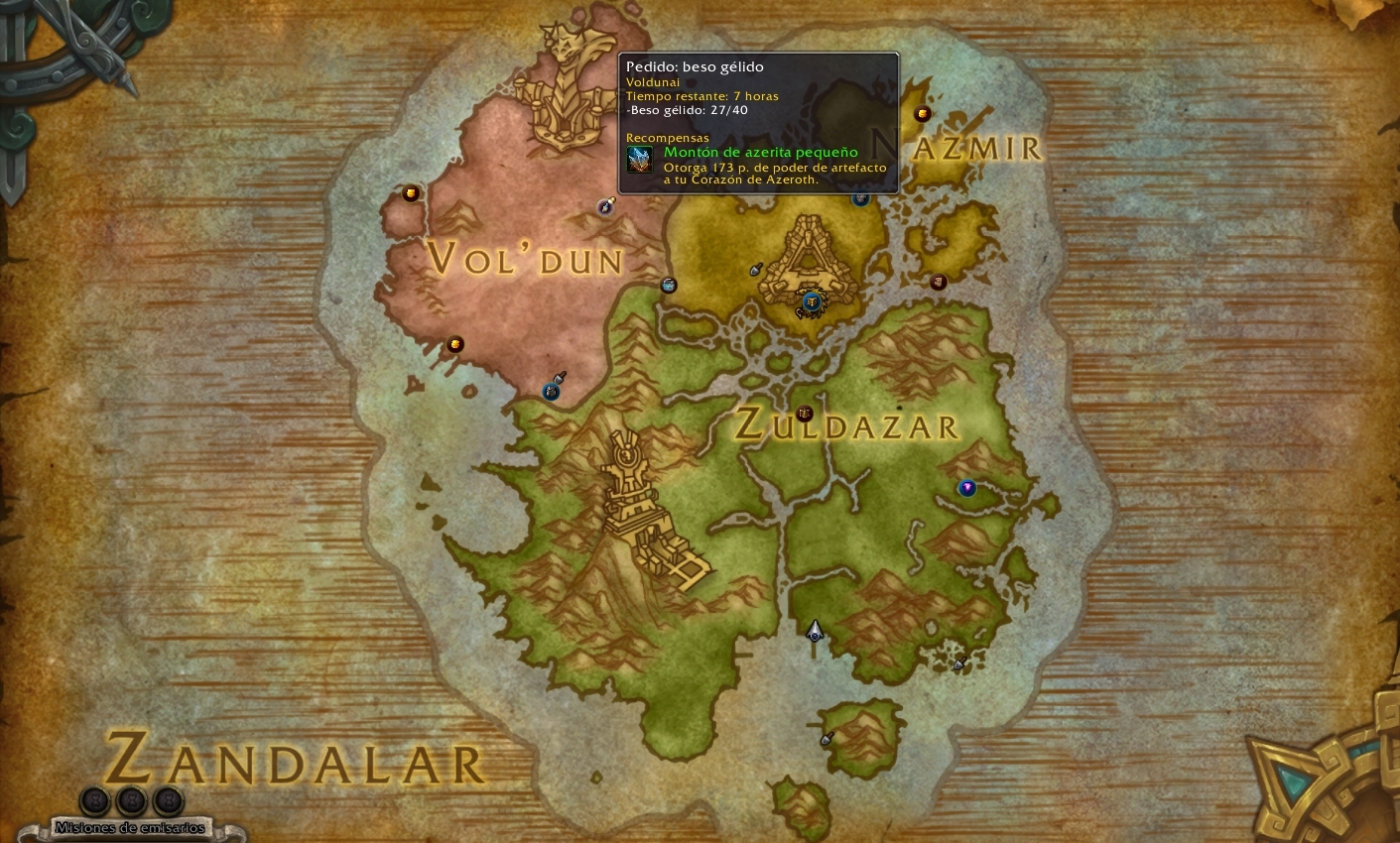 Tendremos una visión global de todas y cada una de las misiones de mundo que se encuentran en Zandalar o Kul Tiras. Sin necesidad de acudir zona por zona, si tenemos una visión de todo el continente, ya podremos ver claramente el tipo de recompensas que viene asociada dicha misión de mundo.