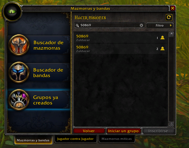 Cuando entramos en una misión de mundo, automáticamente nos saltará una aviso de si queremos buscar grupo con el que realizar dicha misión. Si la respuesta es afirmativa, nos abrirá un recuadro en el que tendremos que escribir la ID de la misión de mundo (te la proporciona el propio addon). En el momento que la escribimos, encontraremos varios grupos que se han formado y procederemos a solicitar incorporarnos a algunos de ellos.
